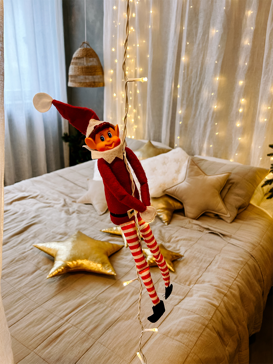 Oto Elf Psotnik w samej sobie! Wysłannik Świętego Mikołaja, który przybywa równo z nadejściem adwentu i towarzyszy Wam cały czas aż do Świąt. Dzięki niemu, okres ten obfituje w wesołe psoty, zabawy, wspólne aktynowości. Elf za dnia siedzi sobie spokojnie na półce (legenda głosi, że nie wolno go dotykać – traci wtedy magię), w nocy zaś ożywa i psoci w całym domu. Oczywiście z pomocą kreatywnych rodziców ;). Każdego ranka dziecko ma nie lada frajdę odkrywając co tym razem odstawił Elf. A psoty mogą być przeróżne – rozsypana mąka w kuchni, ślady po imprezowaniu z zabawkami, związane buty, rozwinięty papier toaletowy na pół domu. Ograniczeniem jest tylko wyobraźnia.