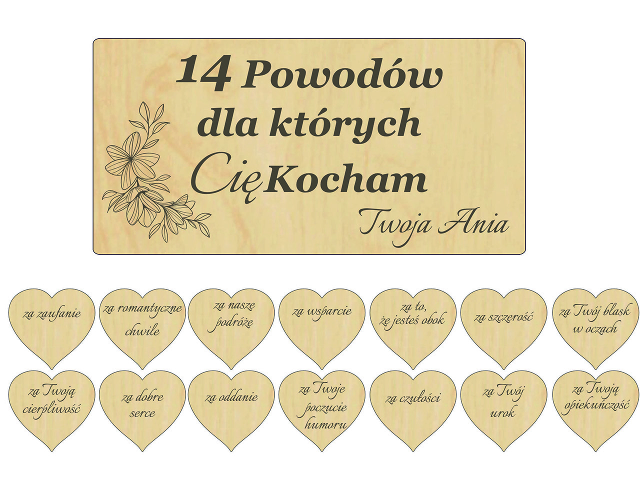14 powodów, dla których kochasz najbliższą Ci osobę? Z pewnością jest ich więcej! Wyraź jednak te najważniejsze powody za pomocą uroczych serduszek z grawerem, zamkniętych w eleganckiej, drewnianej szkatułce. Na szkatułce dodamy personalizowany napis z imieniem osoby wręczającej prezent. Zastosowane materiały zapewnią trwałość na długi czas, laser nanosimy wysokiej jakości sprzętem, dzięki czemu grawer jest czysty, estetyczny, nie ma okopceń.
